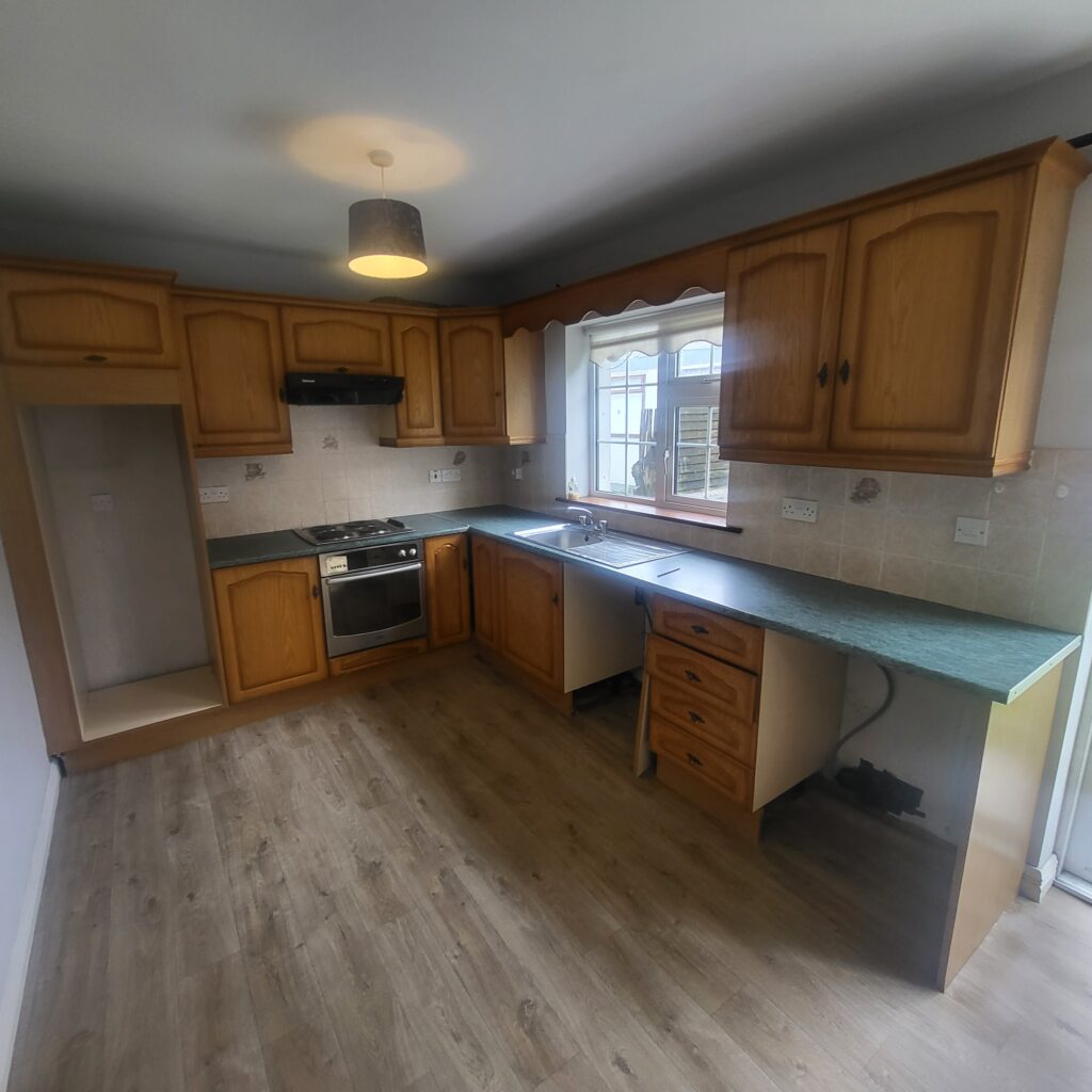 Kitchen/Dining. 5.47 m x 3.90 m. large room with fitted oak kitchen, patio doors & laminated flooring.