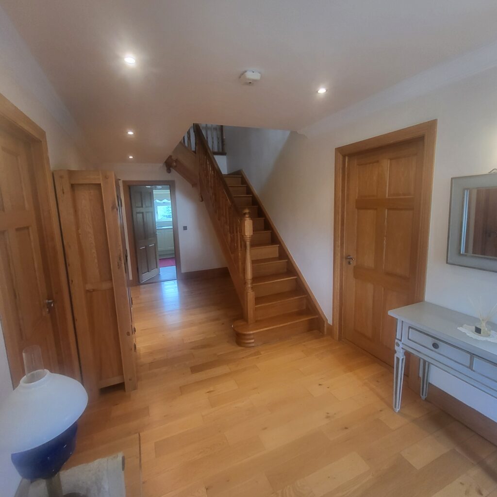 Entrance Hall. 6.4 m x 2.57 m. this large bright entrance has Oak flooring, oak staircase, coving and oak doors, skirting & architrave.