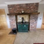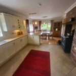 Kitchen/Dining. 7.81 m x 3.92 m. large bright room with painted kitchen & appliances, tiled floor in the kitchen & wood flooring in the dining area. feature brick chimney with stanley solid fuel range for dual heating, coving.